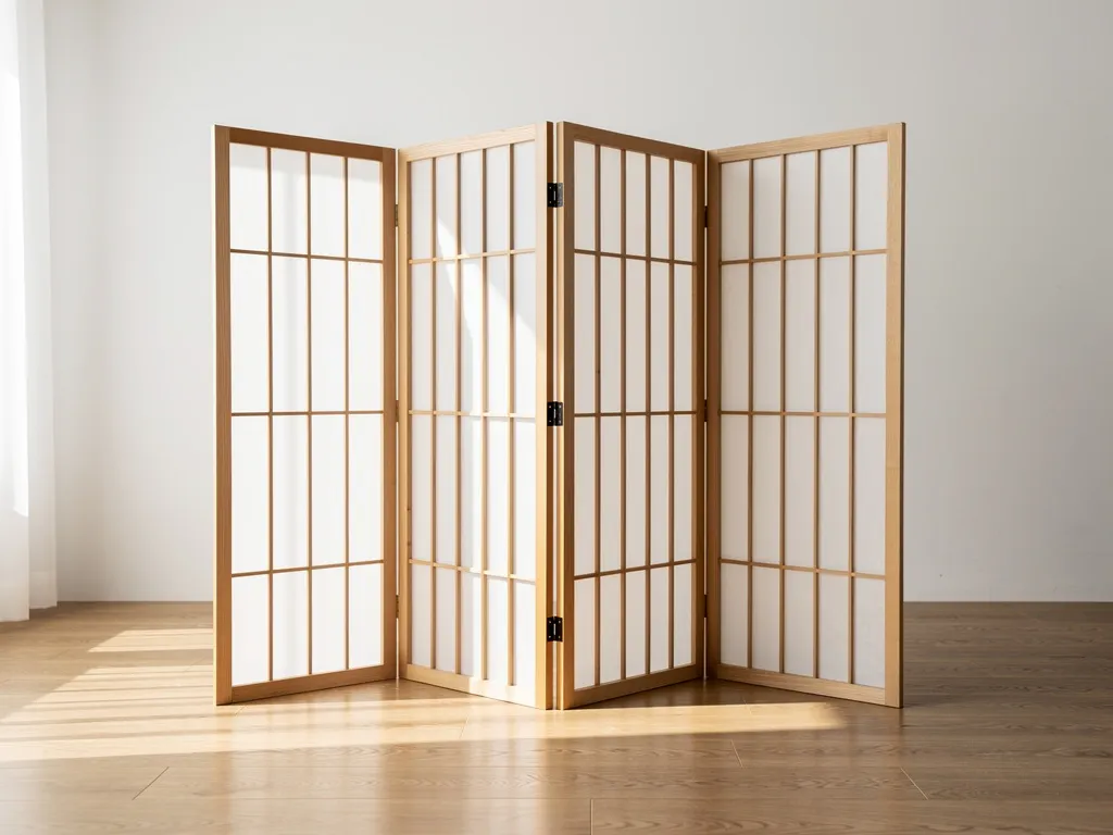 Traditioneel Japans kamerscherm met houten frame en witte papieren panelen in zigzagpatroon op gepolijste houten vloer 13 april 2026