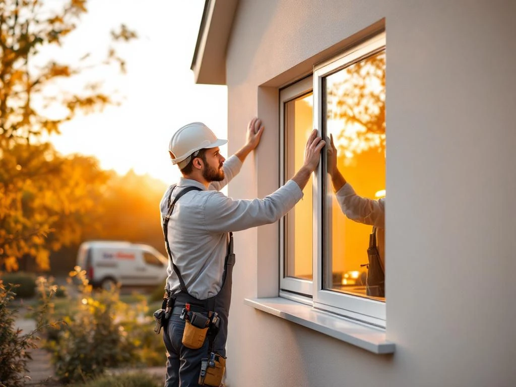 Jordens vakman installeert witte PVC raamkozijnen op moderne Nederlandse woning tijdens gouden uur met bedrijfswagen op achtergrond 9 februari 2026