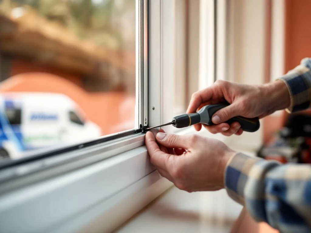 Vakman repareert wit PVC-raamkozijn met gespecialiseerd gereedschap, Jordens bedrijfswagen op achtergrond 10 januari 2026